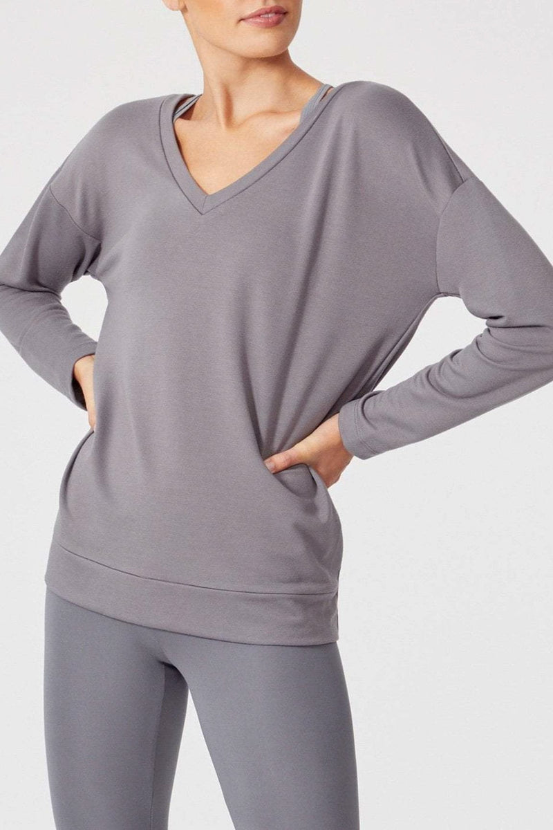 Comfort does not outdo style (and vice-versa) in this relaxed-fit, long dolman-sleeve tee with its faux-wrap back, support strap, and dropped shoulders.